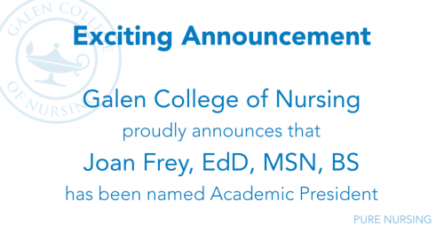 March 27, 2017 — Louisville, KY — Galen College of Nursing announced today that Joan Frey, EdD, MSN, BS has accepted the position of Academic President. Since 2008, Dr. Frey served as the Dean of Galen’s Louisville campus, having lead in the role of acting Academic President since May of 2016. As Galen’s Academic President, Dr. Frey will be 100% focused on developing and maintaining the critical resources necessary to continue the advancement of academic quality in support of Galen’s growing role in nursing education.